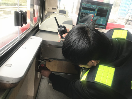 圖為工作人員自查崗亭報警器 此外,工作人員對收費區(qū)域內(nèi)的消防、交通、崗亭設施設備,以及票證、通行費等安全情況進行了一次自查,確保安全用電,做好消防和防盜措施,并對當班收費員進行現(xiàn)場稽查,檢查大家在當班期間的崗亭環(huán)境是否衛(wèi)生,臺面是否整齊,著裝是否統(tǒng)一,有無佩戴上崗證,儀表舉止是否規(guī)范,文明用語是否親切,以及抽屜大額現(xiàn)金有沒按規(guī)定放入保險箱等。大家的合力檢查和相互配合,為春運安全暢通、防寒防凍工作提供了強有力的保障。 陳瑩