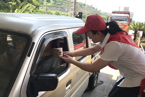 “大中午的,天氣熱,剛才還暈乎乎的想睡覺,現在喝了一杯冰冰涼的綠豆湯,整個人都舒暢了。”一位貨車師傅開心地說。 “沒想到,你們收費站還有這個服務,這次我要出趟遠門,說不定路上還真能用的上,謝謝呀!”一位接過礦泉水和風油精的老師傅連聲道謝。 天氣雖炎熱,服務不“打烊”。 在活動中,志愿者們不顧自身大汗淋漓,仍身披橫幅,頭戴小紅帽,面帶微笑向途經收費所的司機們遞上一杯杯綠豆湯、一瓶瓶礦泉水。同時,大家還不忘宣傳行車安全注意事項,提醒司機朋友在高溫酷暑時節多注意行車安全。