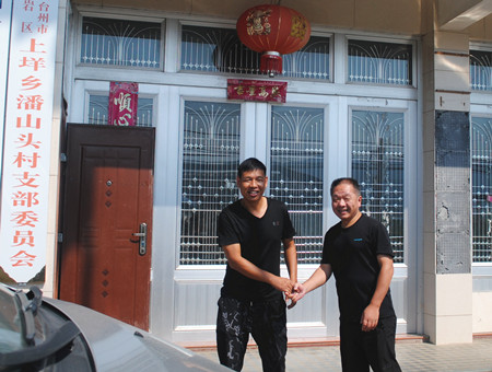 圖為公司黨群部負責人邵克與潘山頭村村長親切握手