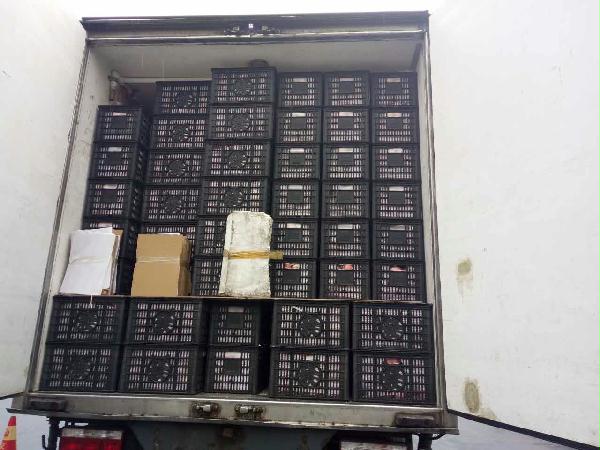 圖為被處罰的車輛 早上10點40分左右,這輛運蘋果的貨車駛入收費站的一號崗亭,司機師傅說自己運的是蘋果,根據公司規定,綠農車檢查必須開車門檢查貨物。憑著多年的檢查經驗,當班班長童軍偉發現這輛綠農車有問題,覺得重量遠遠不夠,可能不符合“綠農”免費政策。果不其然,車廂中“深藏玄機”,左右兩側各有一排玻璃鋼魚箱,這就給檢查增加了難度。當班班長要求司機師傅把最后兩排箱子拿掉,想檢查玻璃魚缸,然而這個司機極其不配合,還惡意刁難工作人員,說什么也不搬蘋果。