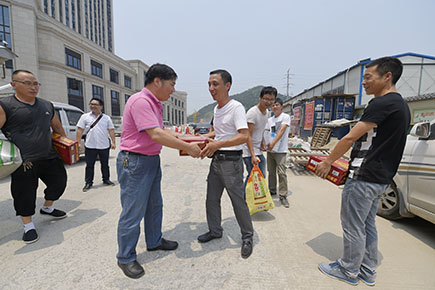圖為公司副董事長、總經理張建平給內環路一線人員送上消暑慰問品 張建平親自將一箱箱的消暑慰問物資送到每位一線工作人員手中,向他們表達公司的謝意。同時詢問了工期進展情況,當前存在的困難和問題,要求他們注意安全,合理安排工程,保證施工質量,上下同心,不懈努力,確保11月11日主線通車目標的實現。