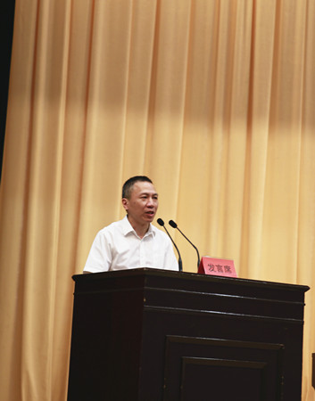 圖為集團黨委副書記、副董事長、總經(jīng)理張建平在主席臺上作交流發(fā)言