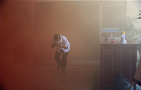 為了模擬的真實性,在未告知的情況下,兩條疏散樓梯中的一條被放置了煙霧彈,模擬通道被堵的情況,撤離人員在引導員的指引下紛紛從另一條安全通道撤離。隨后在一樓大廳還有一項考驗在等著他們,模擬煙霧已經蔓延到一層,兩個煙霧彈滾滾向外冒著濃煙,刺鼻的氣味四處飄散,整個一樓大廳被籠罩在一片黃色煙霧中,能見度極低。這時疏散引導員攜帶的手電筒發揮了作用,在一片迷霧中,明亮的白光成為指引所有逃生人員的一道“生命之光”。五分鐘內,最高的25層人員也已經撤離現場,在大樓西側指定集合點集合,各樓層開始清點人員并匯報情況。