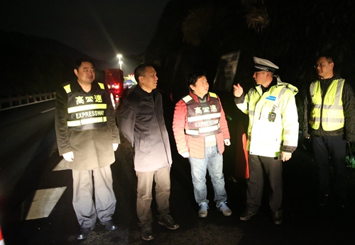 圖為查看險情現場 險情就是命令,臺州高速集團迅速啟動緊急搶險預案,總經理張建平立即奔赴現場指揮,黃土嶺隧道所所長李海福帶領執勤隊第一時間預警處理,工程養護部經理何翔與相關技術人員及施工單位偕同處置險情。20分鐘后,路面碎石已被全部清理至硬路肩,現場放置了沙包防止碎石濺落到車道上,并采取了三類封道,禁止硬路肩通行,對過往車輛提前預警。由于反應迅速、處置及時,本次險情未造成人員傷亡和財產損失。 經檢查發現,因多日連續降雨,導致山體表面土層濕化,引起隧道入口處高邊坡部分塌方,約2立方碎石散落在硬路肩及車道上,在高邊坡二級平臺上,距路面高度約12米處有一塊約0.5立方的大石突出在外,觸目驚心,隨時都有掉落的可能。