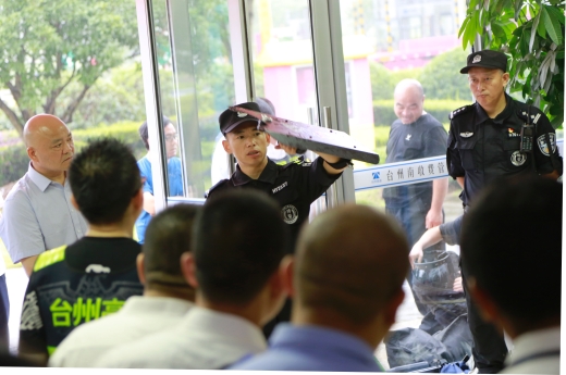 本次活動(dòng)分成防暴器械使用培訓(xùn)、器械使用練習(xí)和防盜搶應(yīng)急演練三個(gè)環(huán)節(jié),以培訓(xùn)和演練相結(jié)合的形式開展,以有效提高一線職工防暴器械使用技能和突發(fā)事件應(yīng)急處置能力?;顒?dòng)邀請(qǐng)了黃巖公安分局巡特警大隊(duì)大隊(duì)長盧健星,該大隊(duì)獵豹突擊隊(duì)隊(duì)員、專職教官盧尚明到場指導(dǎo)。