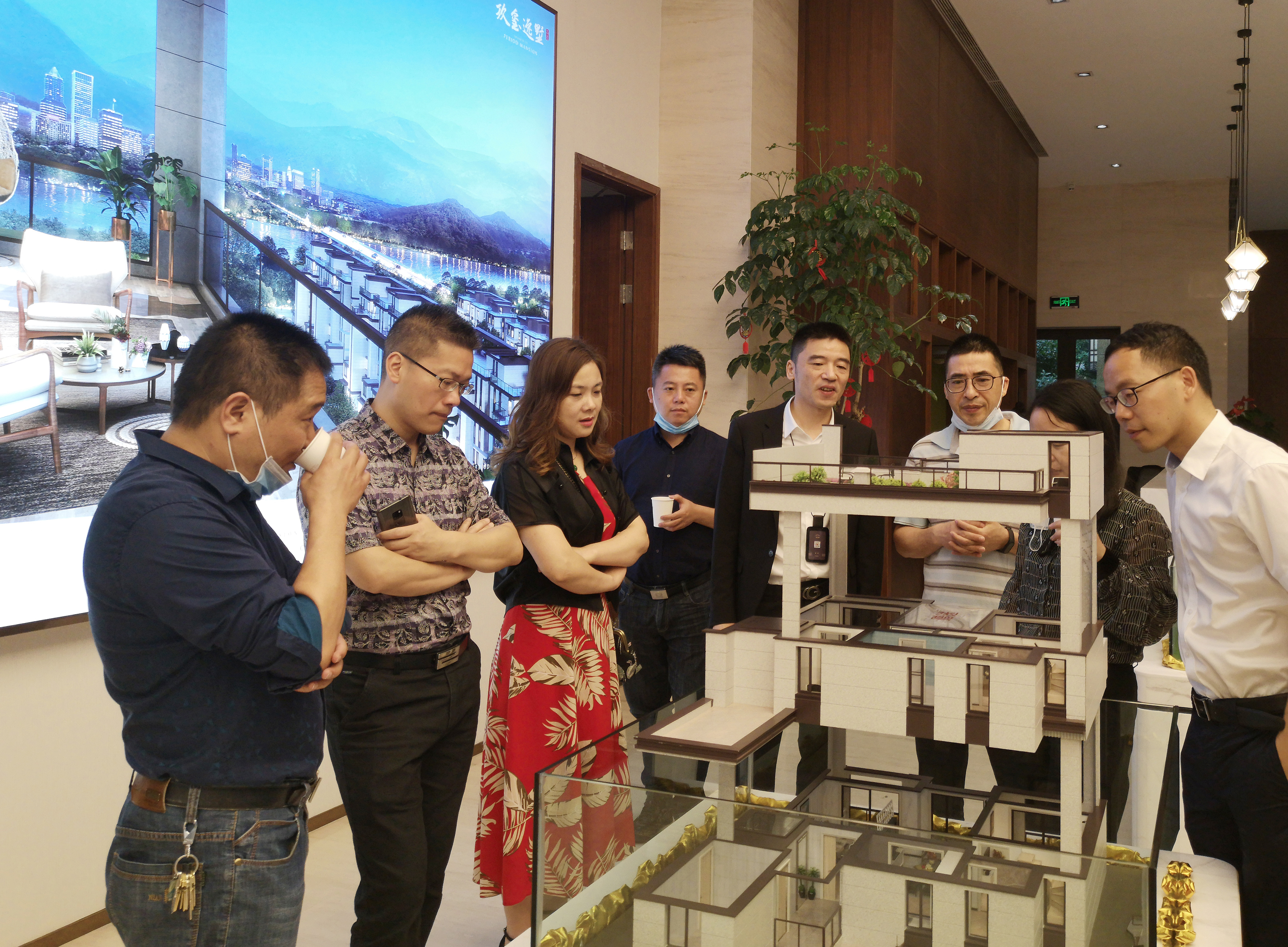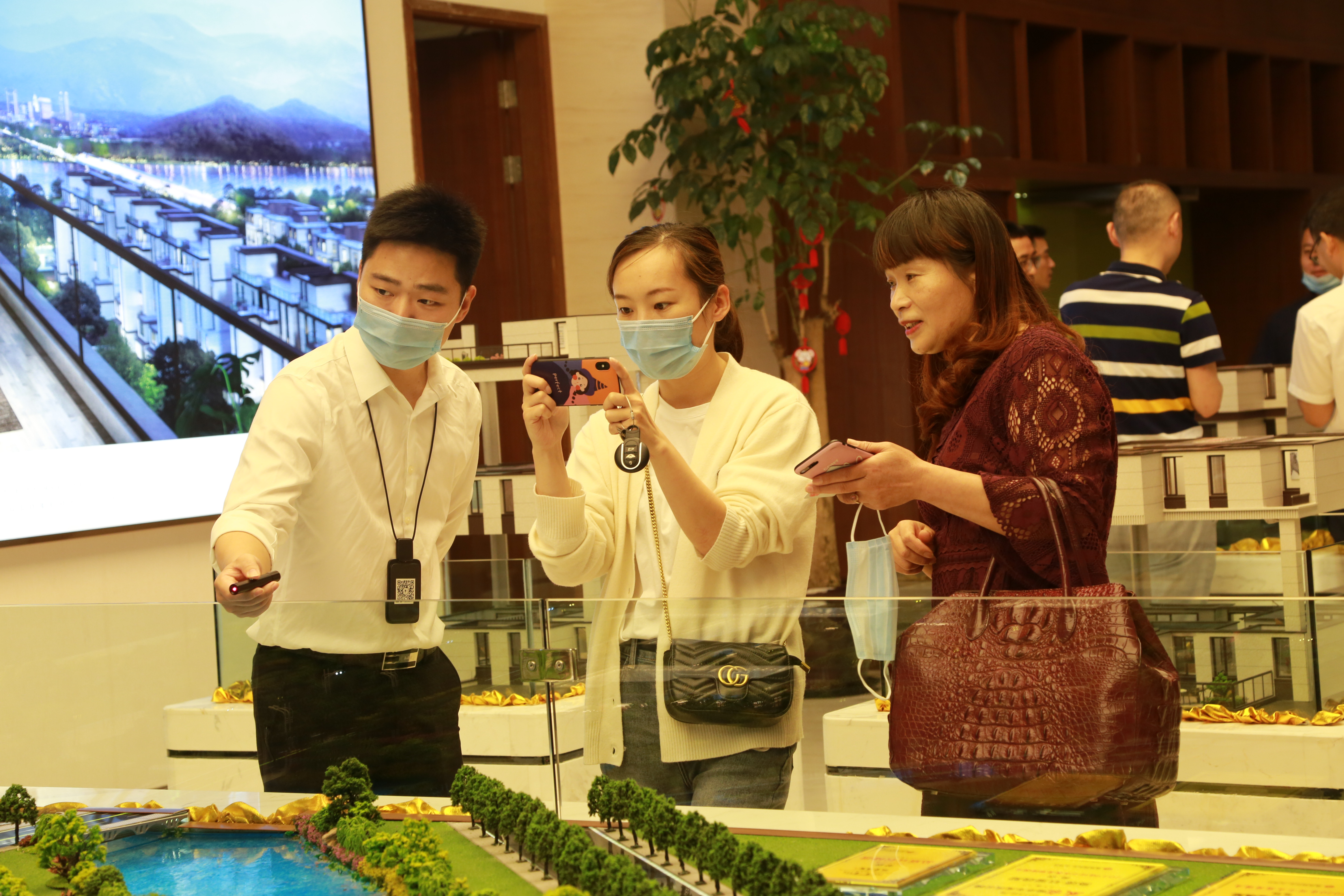 圖為陳文波對照圖紙了解樓盤情況 在銷售展廳樓盤沙盤前,陳文波聽取了高速房產(集團)公司負責人關于玖璽逸墅項目銷售計劃、認籌客戶等情況匯報。他對前期房產公司的辛苦付出給予充分肯定,要求大家認真服務好每一個來訪客戶,彰顯出國企品質,全力做好銷售工作。 當天,銷售展廳樓內,陸陸續續有客戶進出,“我很早就看中這個樓盤了,不僅位置好,而且采光好、通風好,居住在這里一定非常舒服。”一名準客戶張女士夸贊道,今天她特意前來交付認籌金。  圖為客戶在疊墅沙盤前參觀