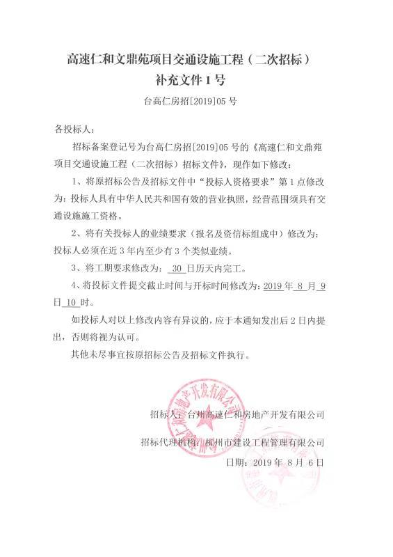 高速仁和文鼎苑項目交通設施工程(二次招標)補充文件1號