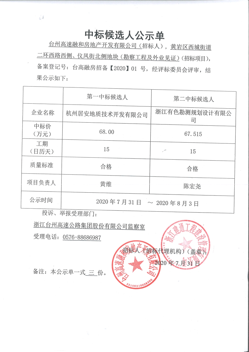 黃巖區西城街道二環西路西側、儀鳳街北側地塊(勘察工程及外業見證)中標候選人公示單