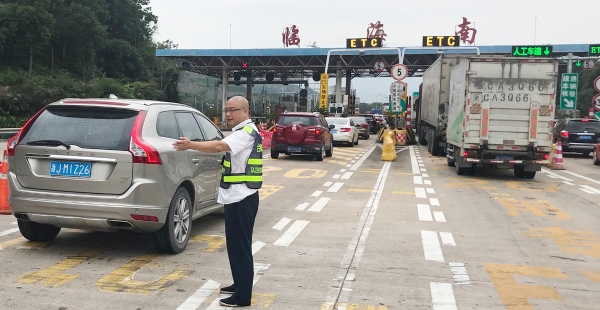 節(jié)日期間,車流量比往日多很多,每天多次出現(xiàn)長(zhǎng)時(shí)間大分流,一遇上高峰期車輛源源不斷地從各個(gè)方向匯聚在此,容易造成內(nèi)外廣場(chǎng)堵車。臨海南收費(fèi)所車輛雖多,但該站所出口秩序井然,未出現(xiàn)擁堵現(xiàn)象。瞧!這位在車流中,身著反光背心在這場(chǎng)大車流中,揮舞著雙臂指揮著交通,讓飛馳的車輛通過(guò)客貨分離,有效降低客貨車隨意串道,達(dá)到快速放行的是四班班長(zhǎng)楊俊輝。